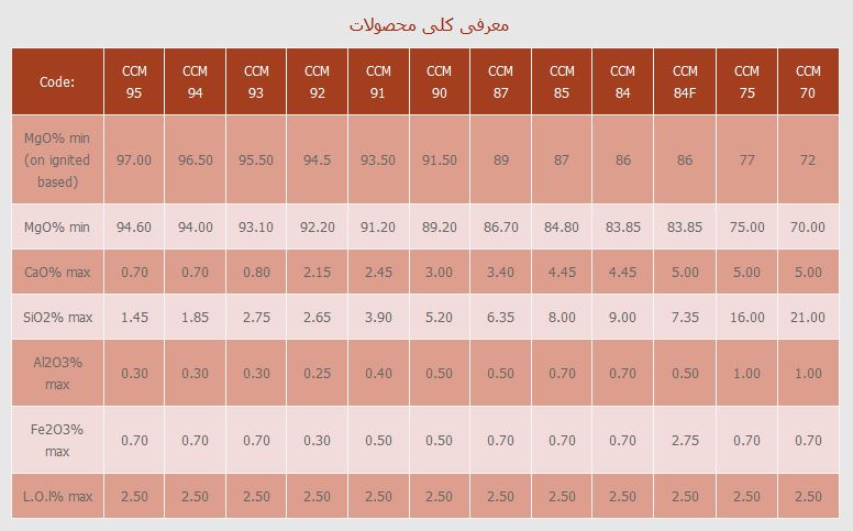 اکسید منیزیم با فرمول شیمیایی MgO با درصد های مختلف و مقدار اکسید منیزیم اکتیو بسیار عالی در چهار دسته کلوخه ای – 0 الی 1 – 1 الی 3 – 3 الی 5 میلیمتری قابل ارائه می باشد. همچنین می توان این ماده را بصورت پودری ارائه داد
